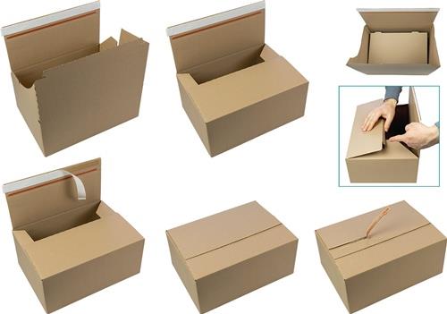 mit Selbstklebeverschluss und Aufreißhilfe · einfaches Aufrichten durch Automatikboden · Boden vollflächig überlappend · Deckel teilüberlappend · mittels Klebeverschluss leicht und ohne zusätzliches Klebeband zu verschließen · schnelles Öffnen durch Aufreißhilfe · deutlich reduzierte Packzeiten · Qualität 1.20 B · 1-wellig