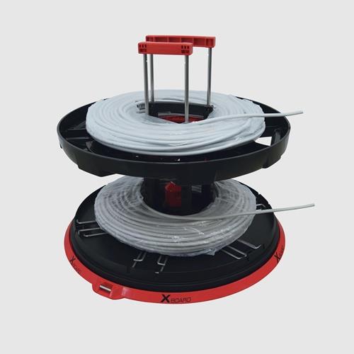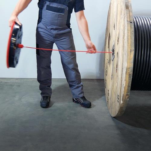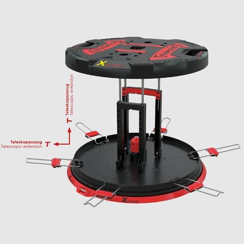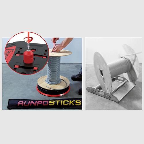 mit neuen Teleskopauszügen · mehr Auflagefläche durch die 6 ausklappbaren Auflageverbreitungen - bis Ø 800 mm teleskopisch ausziehbar · Füllhöhe 390 mm - große Rohrbünde problemlos abrollbar · vertikalen Klappbügel können teleskopisch ausgezogen werden und eignen sich noch besser um 2 Kabelringe/-bünde gleichzeitig abzurollen · 2 x praktische RUNPOSTICKS Ø 7,5 mm – Länge 410 mm sind im Lieferumfang enthalten und dienen dazu kleine oder leichte Trommeln zu fixieren · RUNPOSTICKS sind im Deckel verstaut