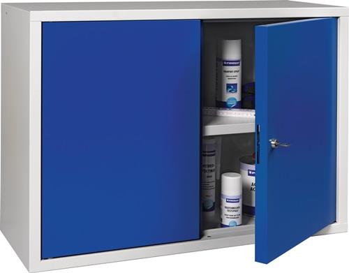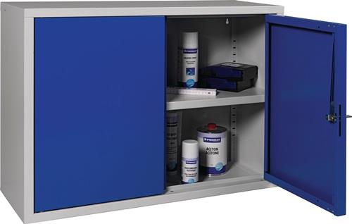 stabile Stahlblechkonstruktion, pulverbeschichtet · Türen aus Vollblech, abschließbar mit Zylinderschloss · Fachboden höhenverstellbar, Tragfähigkeit 15 kg