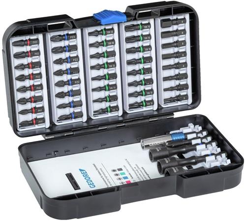 umfangreiches Sortiment mit den gängigsten Bit-Profilgrößen · Bits mit Torsionszone zum Schutz des Bit-Profils vor Verschleiß · Farbcodierung vereinfacht die Profilerkennung und Zuordnung · 1/4″ Vierkant-Adapter für mehr Flexibilität Weitere technische Eigenschaften: · Gesamtbreite: 190mm · Gesamthöhe: 45mm · Gesamtiefe: 120mm · Netto-Gewicht: 0,57kg